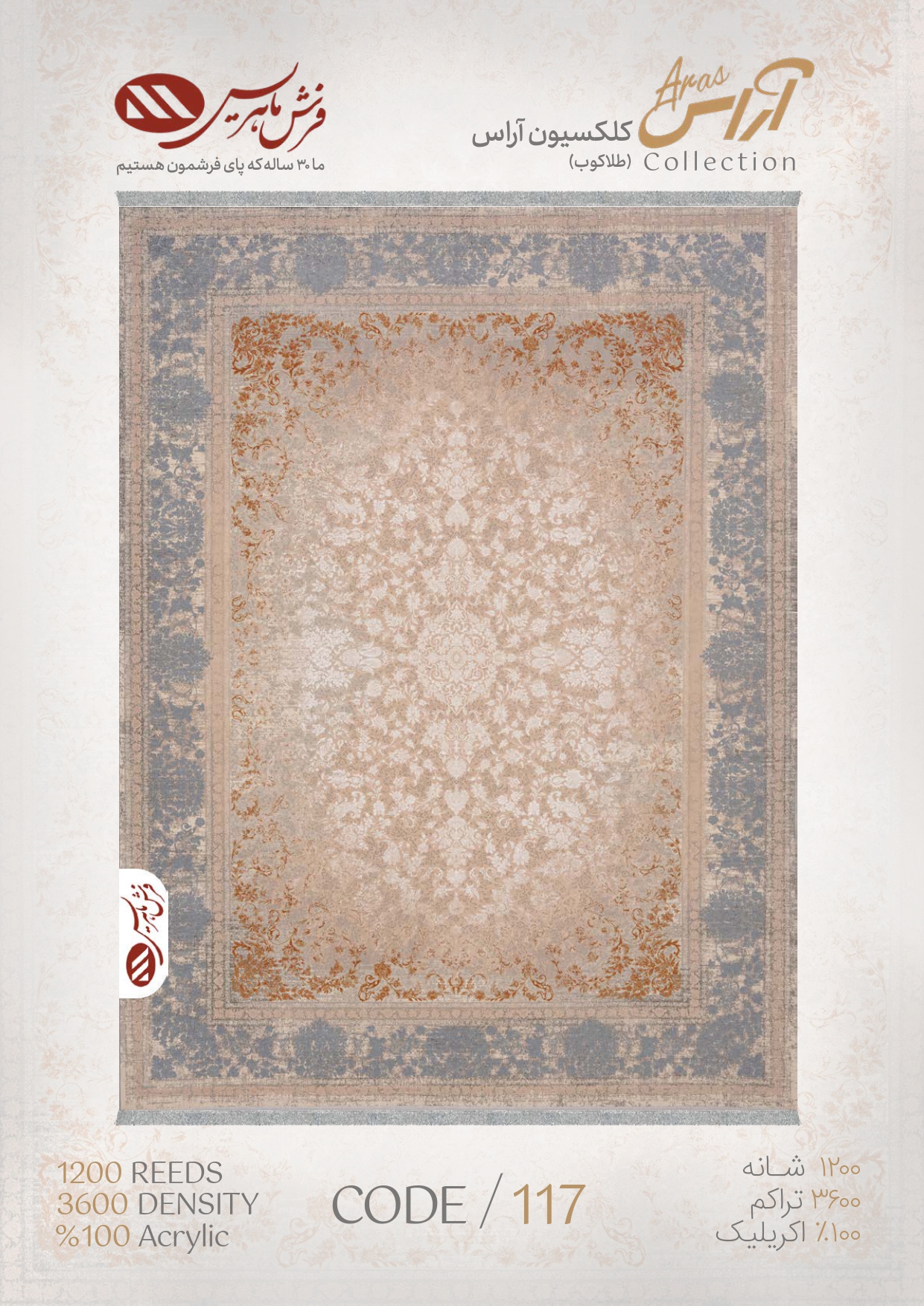 فرش ماشینی مدل آراس کد 117 با طرح زیبا و دل انگیز خود به خانه شما اصالتی از هنر ایرانی و فرهنگی اصیل داده و زیبایی آنرا نیز چند برابر می کند .