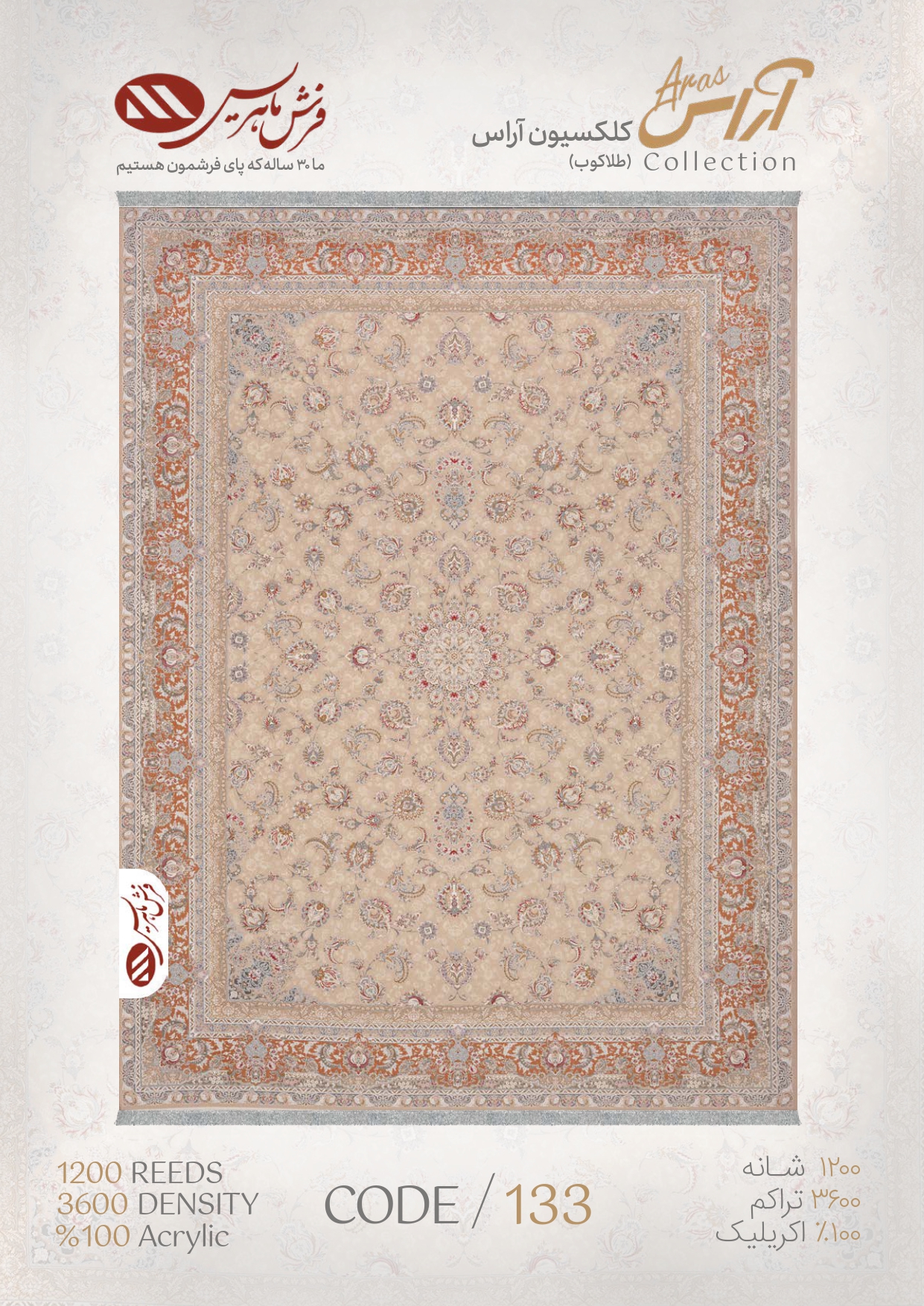 فرش ماشینی مدل آراس کد 133 با طرح زیبا و دل انگیز خود به خانه شما اصالتی از هنر ایرانی و فرهنگی اصیل داده و زیبایی آنرا نیز چند برابر می کند .