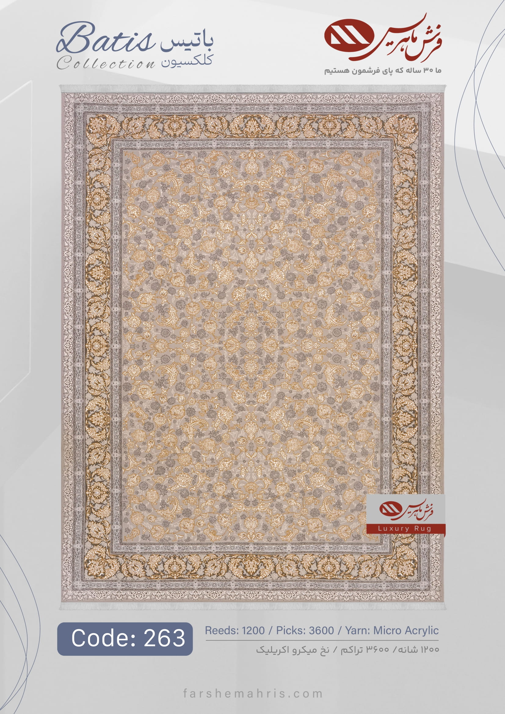 فرش ماشینی مدل باتیس کد 263 با طرح زیبا و دل انگیز خود به خانه شما اصالتی از هنر ایرانی و فرهنگی اصیل داده و زیبایی آنرا نیز چند برابر می کند .
