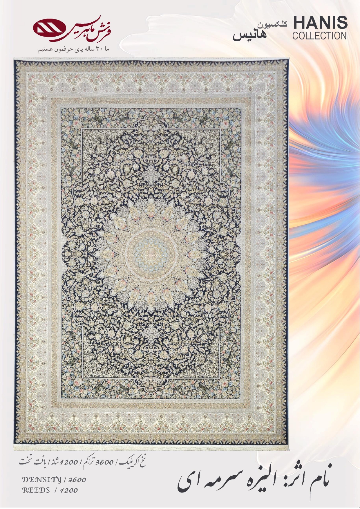 فرش ماشینی مدل هانیس نام اثر الیزه سرمه ای با طرح زیبا و دل انگیز خود به خانه شما اصالتی از هنر ایرانی و فرهنگی اصیل داده و زیبایی آنرا نیز چند برابر می کند .