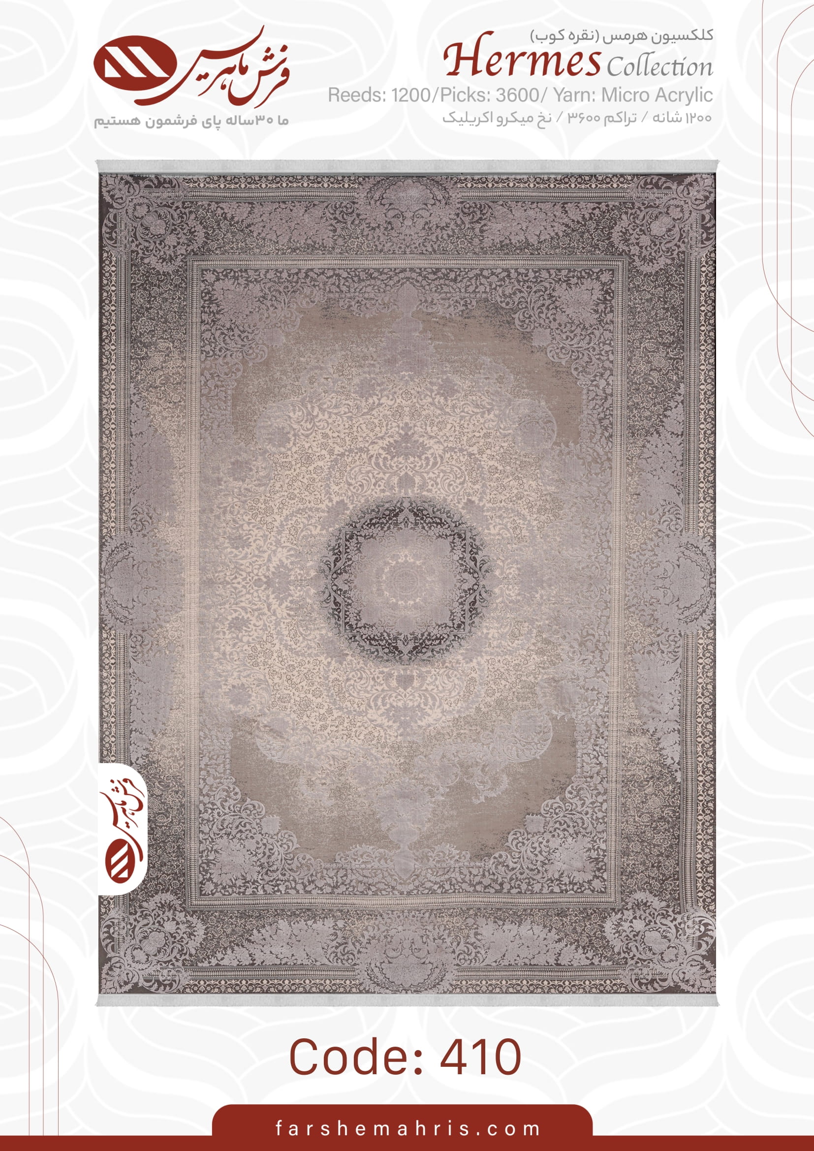 فرش ماشینی مدل هرمس کد 410 با طرح زیبا و دل انگیز خود به خانه شما اصالتی از هنر ایرانی و فرهنگی اصیل داده و زیبایی آنرا نیز چند برابر می کند .