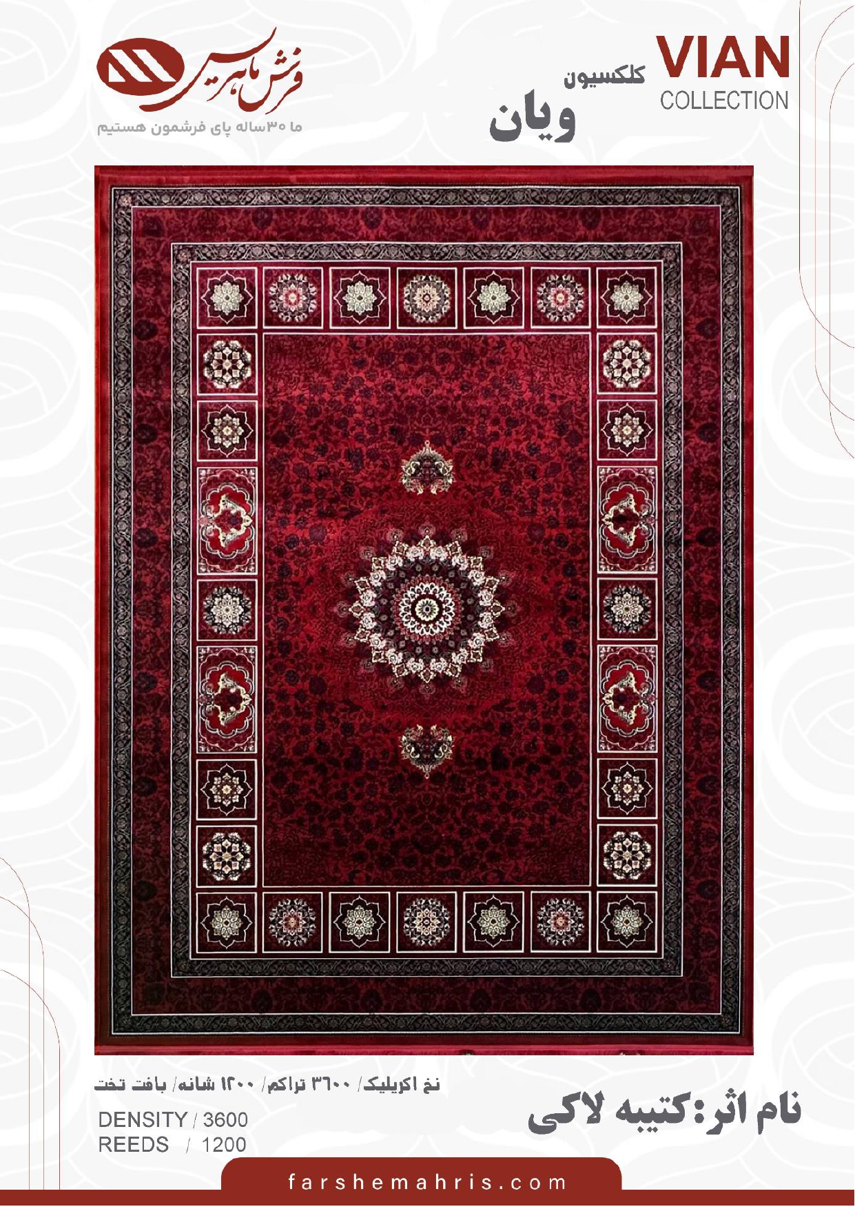 فرش ماشینی مدل ویان نام اثر کتیبه لاکی با طرح زیبا و دل انگیز خود به خانه شما اصالتی از هنر ایرانی و فرهنگی اصیل داده و زیبایی آنرا نیز چند برابر می کند .
